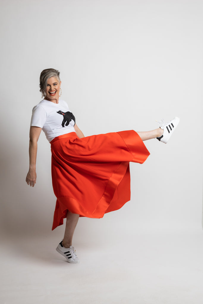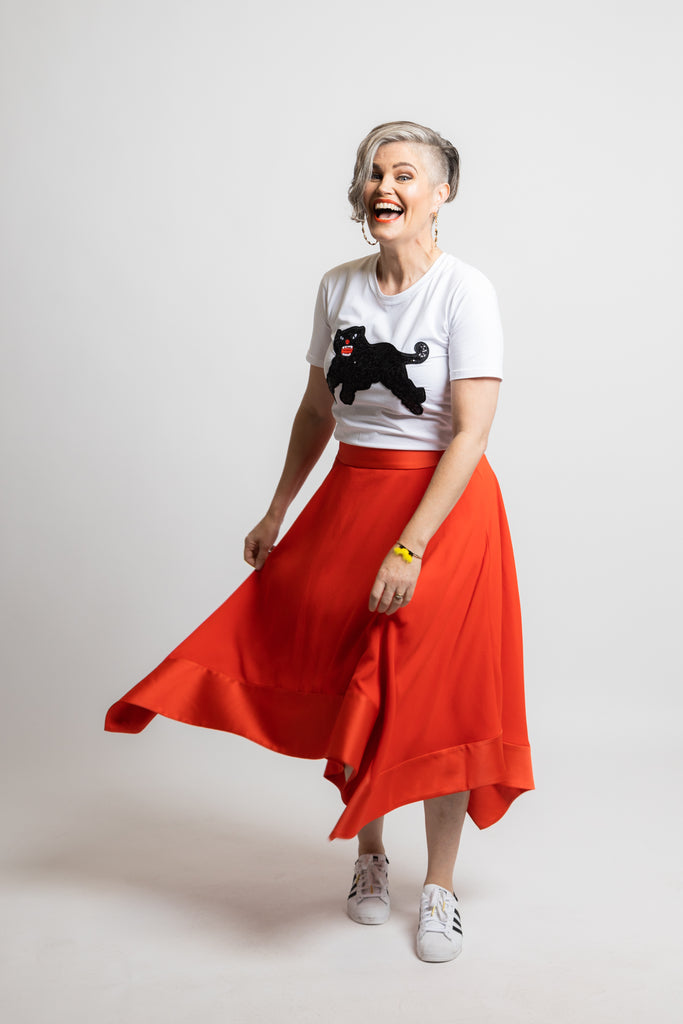 Red swing skirt by Kenzo is knee length with a satin waist band and hem detail, zip closure.