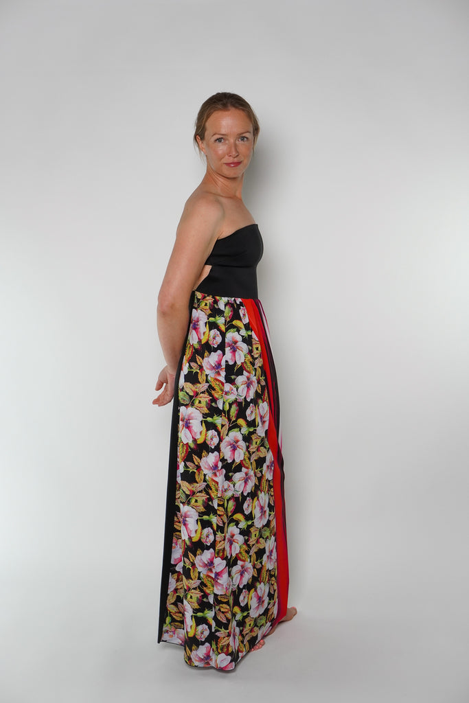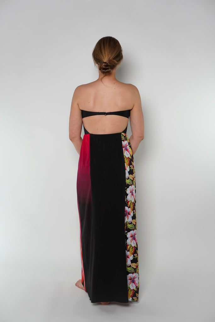 Strapless a-line maxi dress with a fabulous mix of prints and patterns, with every angle showing a different colour and shape!