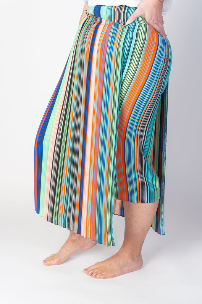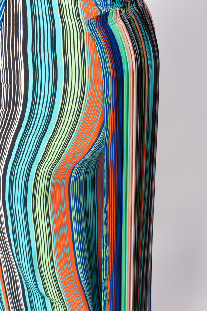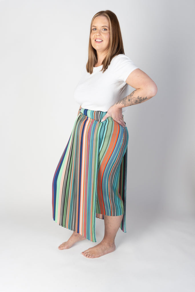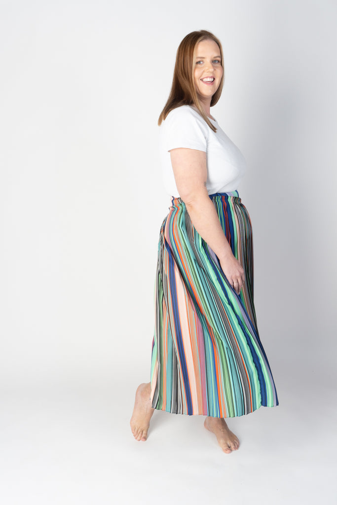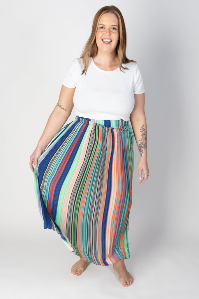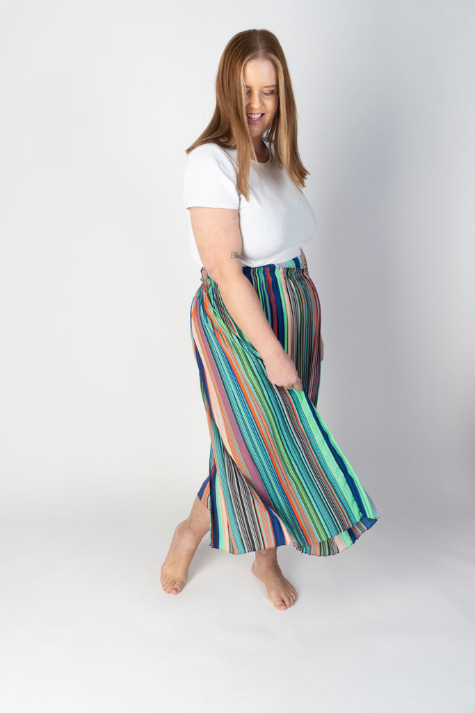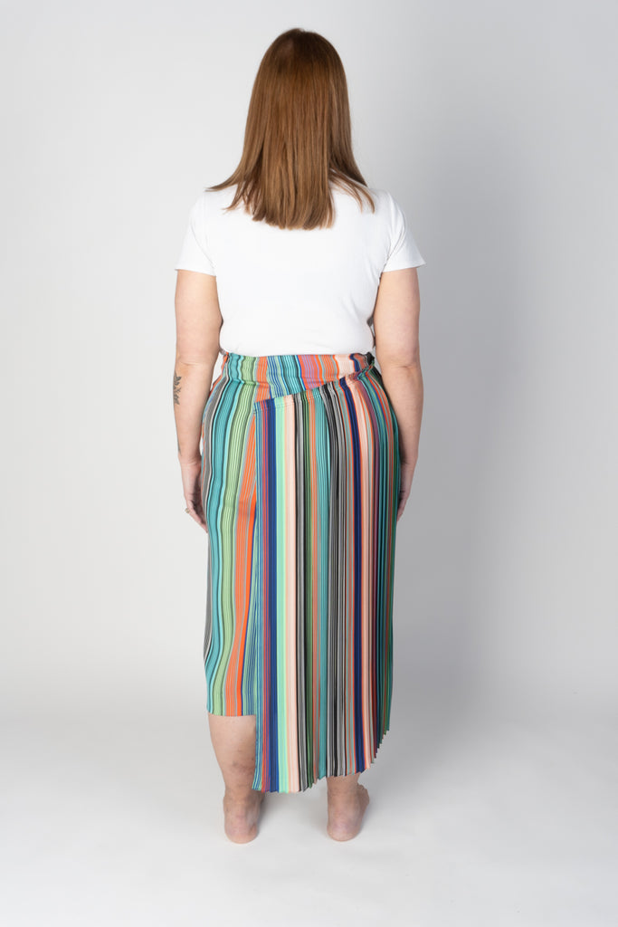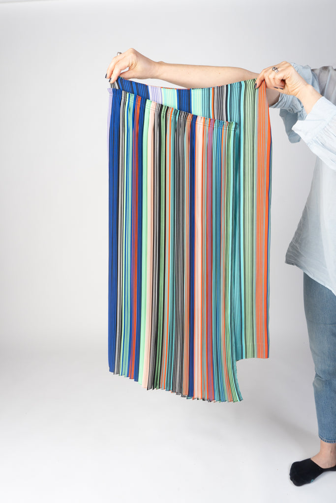 This gorgeous green striped skirt has pleated accents, an assymetrical detailing with a zip closure and falls just below the knees.
