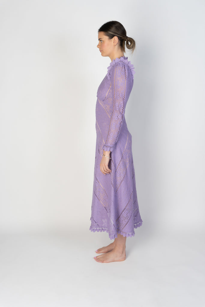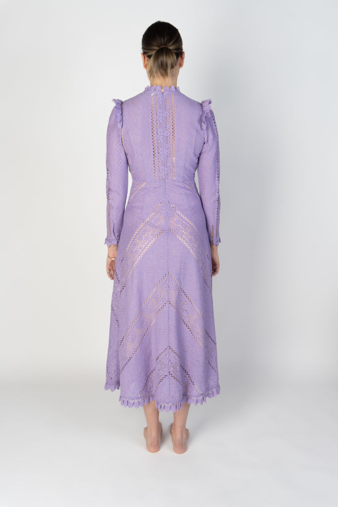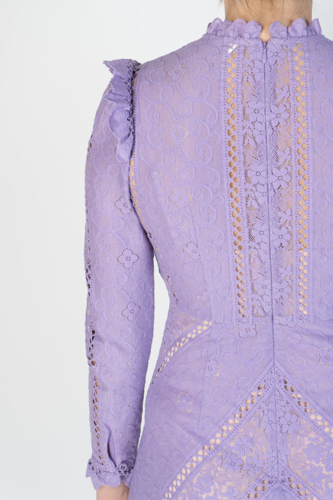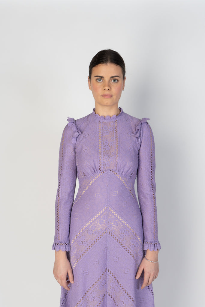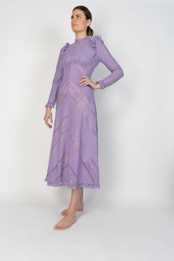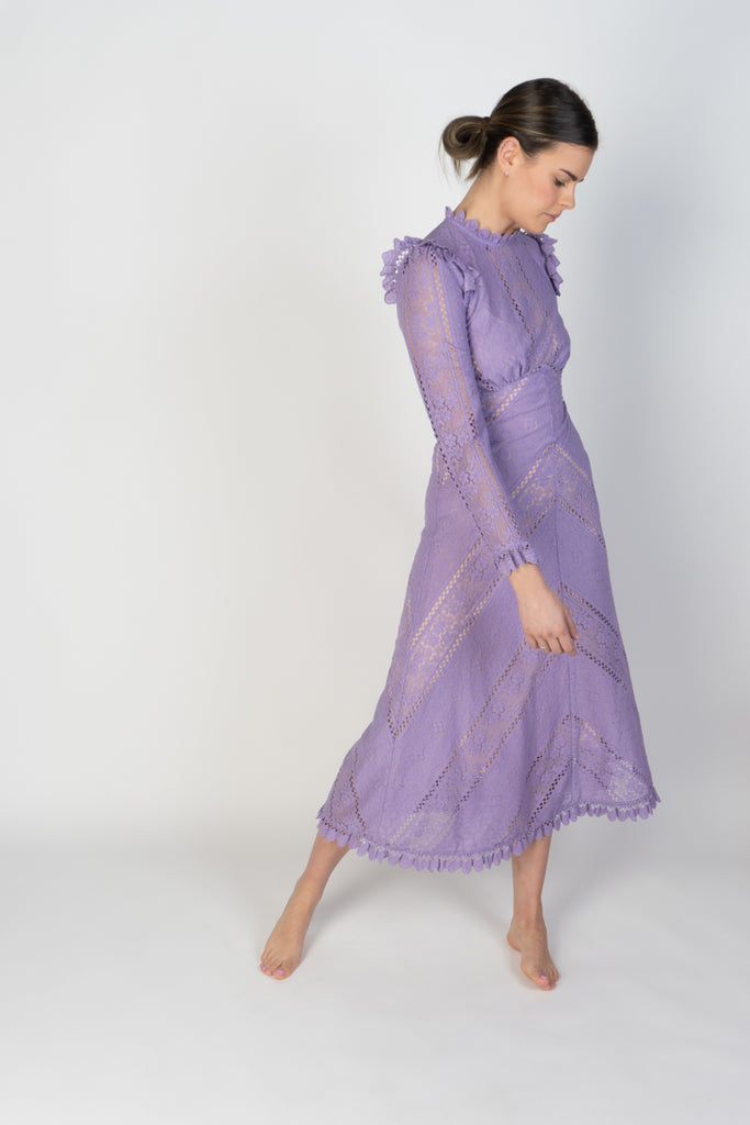 This stunning dress is the most beautiful colour of the season, Lavender. With gorgeous long sleeves, zip back, high neck and mid length. What a timeless but stand out piece.
