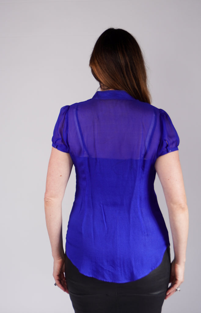 Capped sleeved electric blue button up sheer blouse. Worn with jeans or a skirt, this shirt will brighten up any outfit.