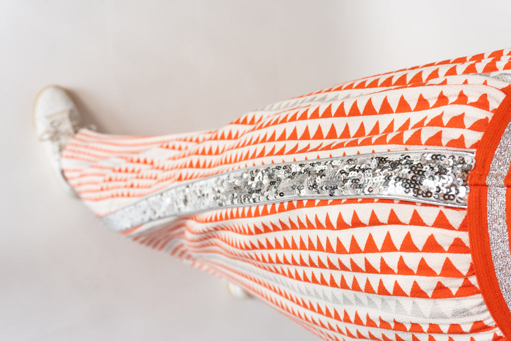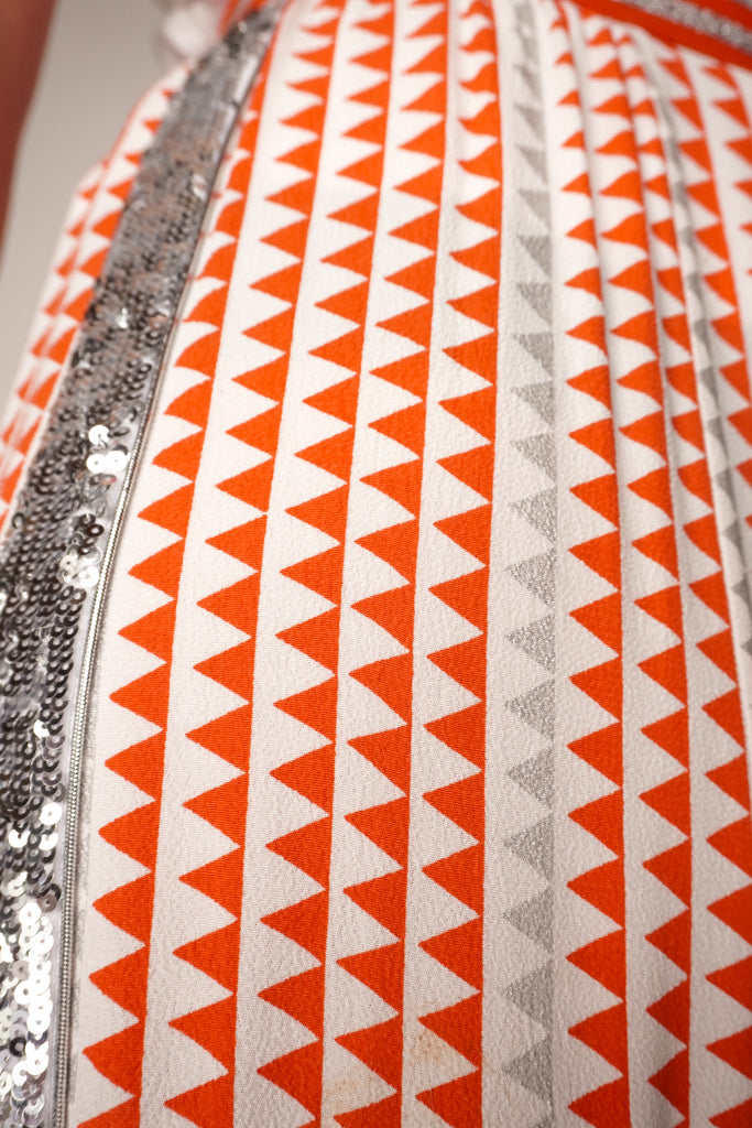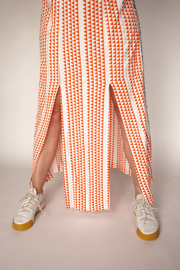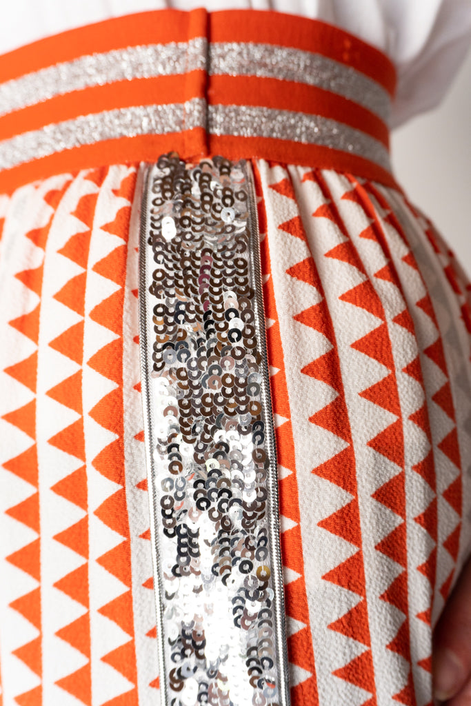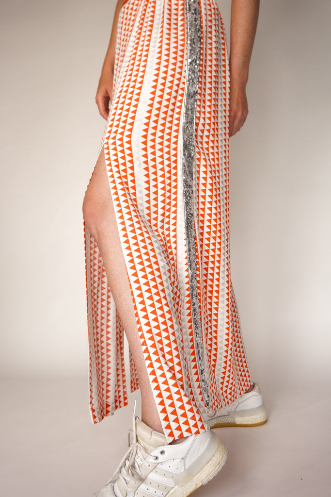 Beautiful patterned maxi skirt in orange, white and with a sequin detailing on the side. Skirt features two front side splits and a slight elasticated waistband.