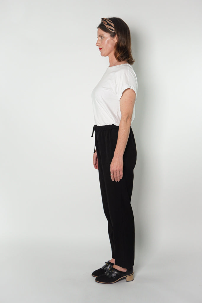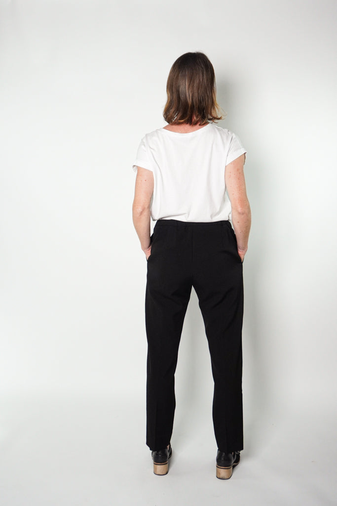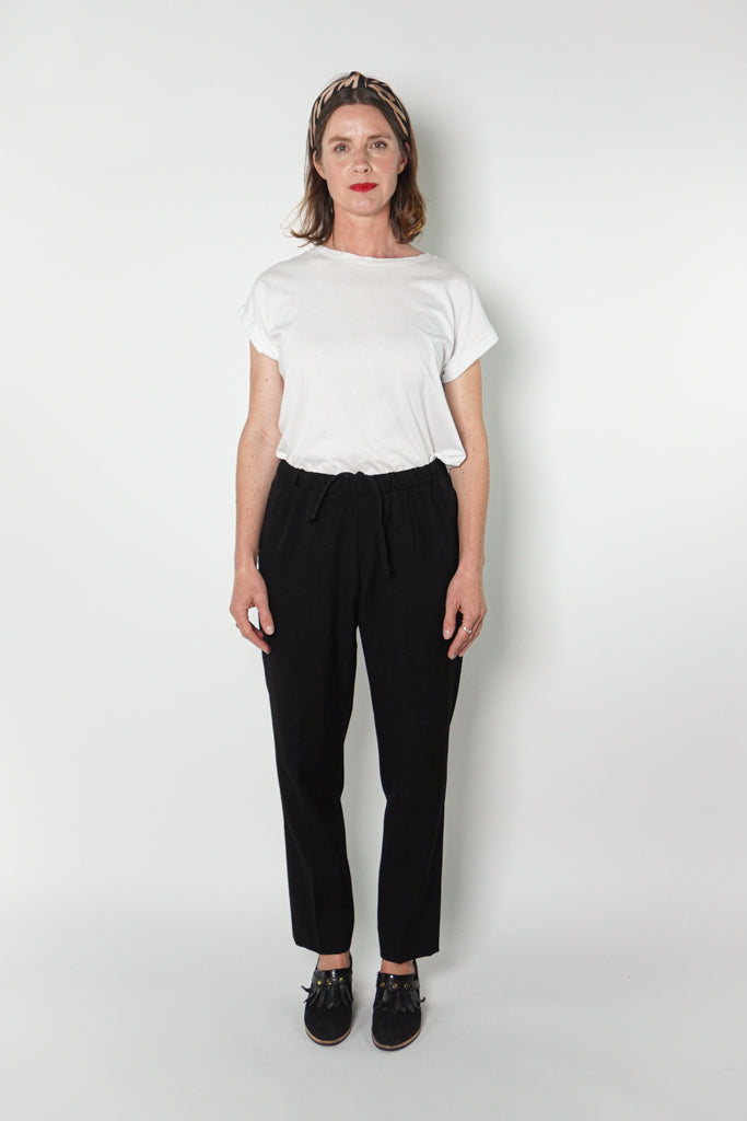 Wool straight leg pants, mid-rise with slit pockets and an elasticised waist.