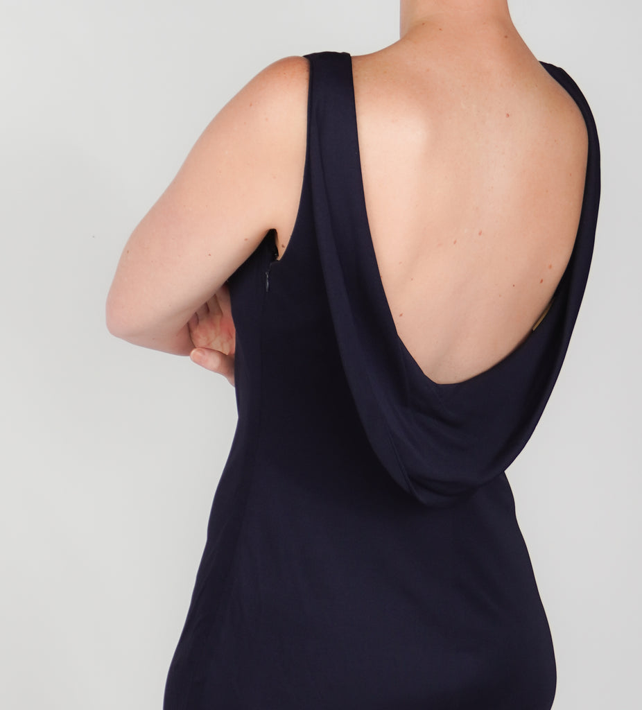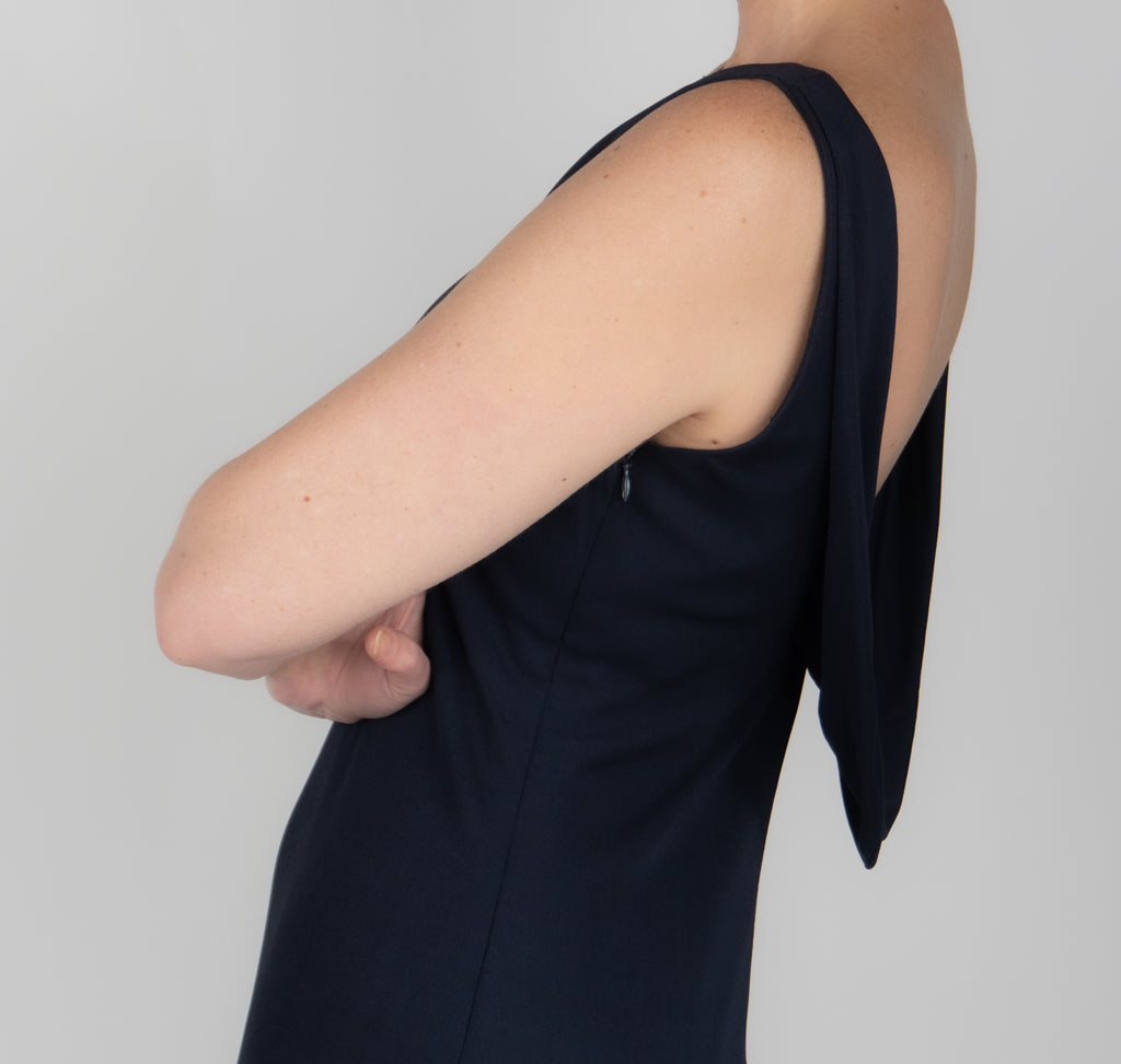Vera Wang sleeveless A-line evening dress with crew neck, draped accents at back and concealed zip closure at side.