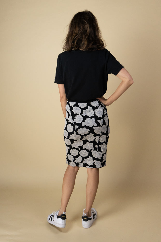 Black and white flower print Nina Ricci knit knee-length skirt with tonal stitching and elasticized waistband.