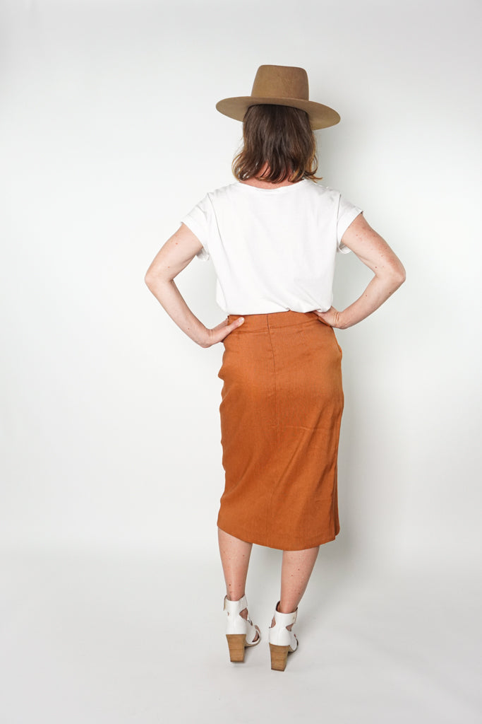 Veronica Beard linen skirt in an orange hue, sarong style shape with a zip closure at back and buckle detail at the side.