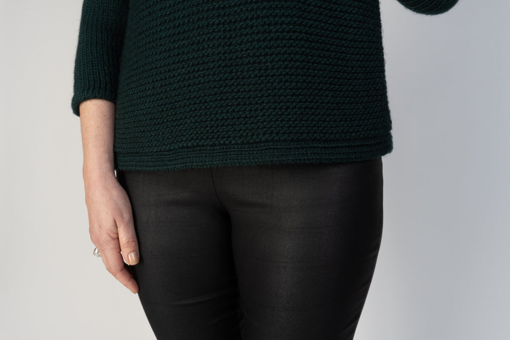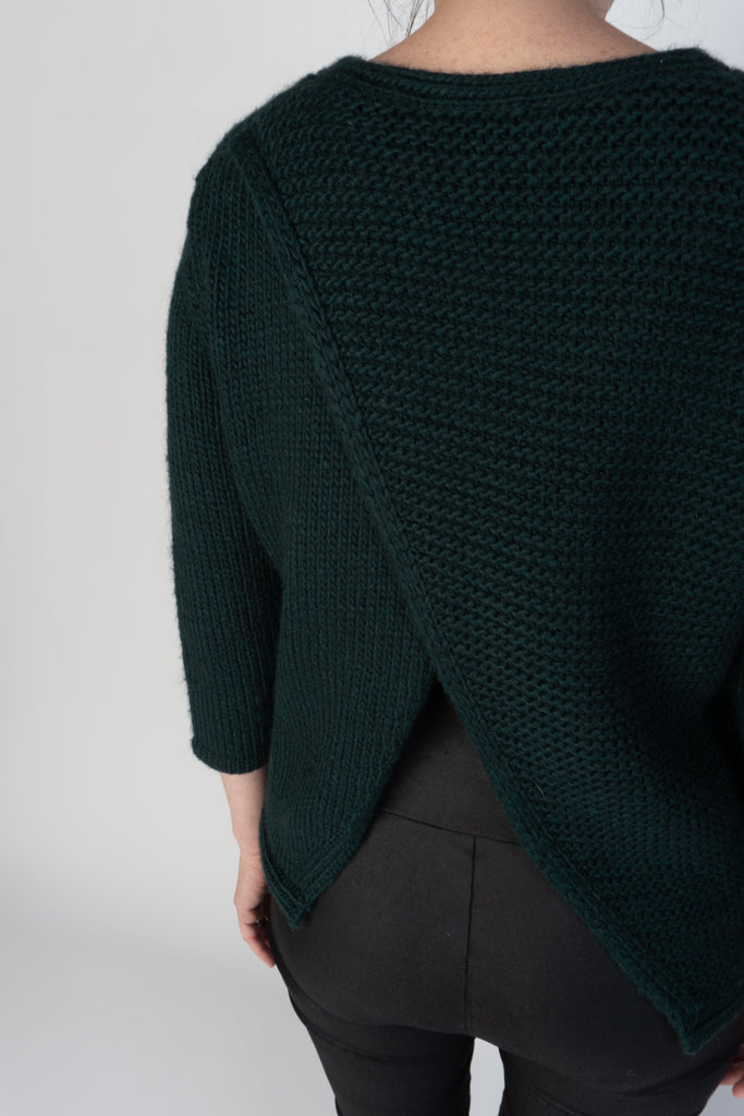 Deep forest green jumper with ribbed detailing throughout, cross over design at the back, three-quarter length sleeves and crew neck.