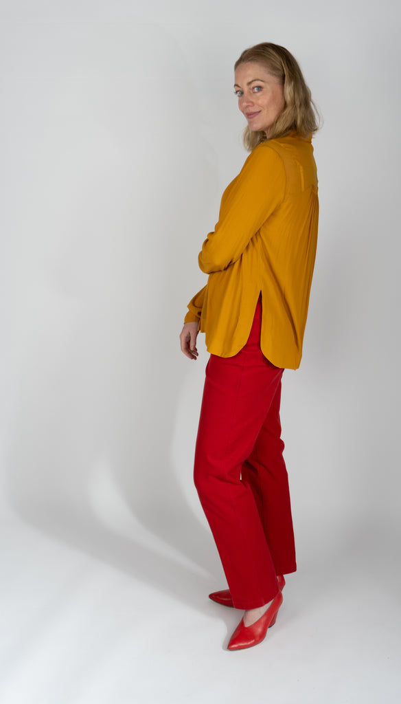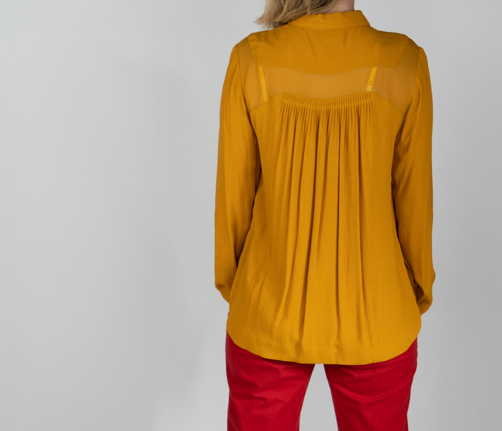 Mustard coloured blouse with point collar, long sleeves and hidden button closures at front.