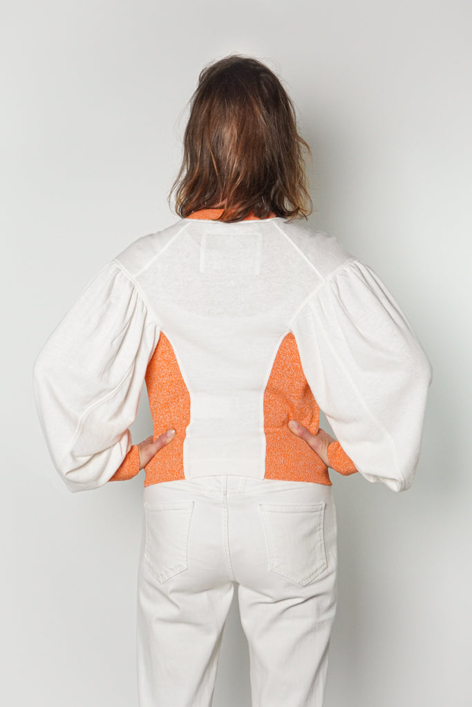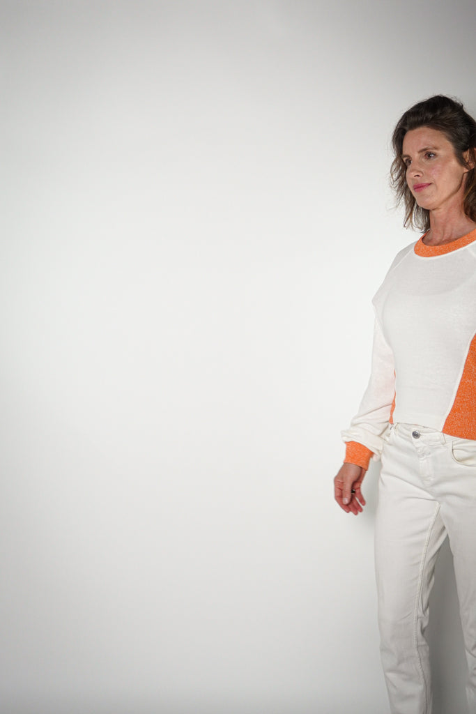 Batwing style sleeves with crew neck in white and peachy orange.