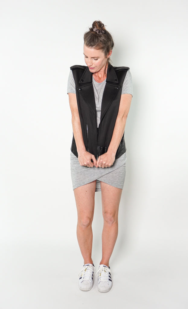 Grey mini dress with short sleeves, crew neck and exposed gold zip detailing on shoulders.