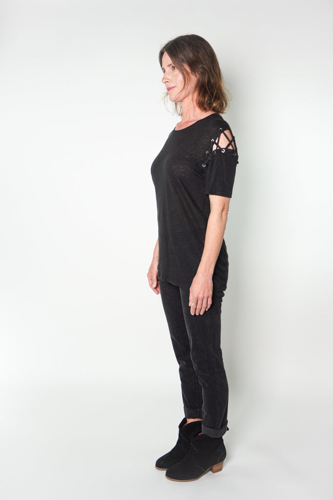 Grey scoop neck short sleeve with laced up detail on the shoulders. Wear with jeans and boots.
