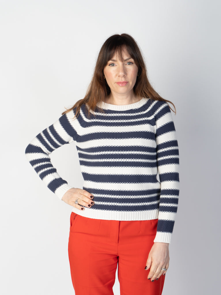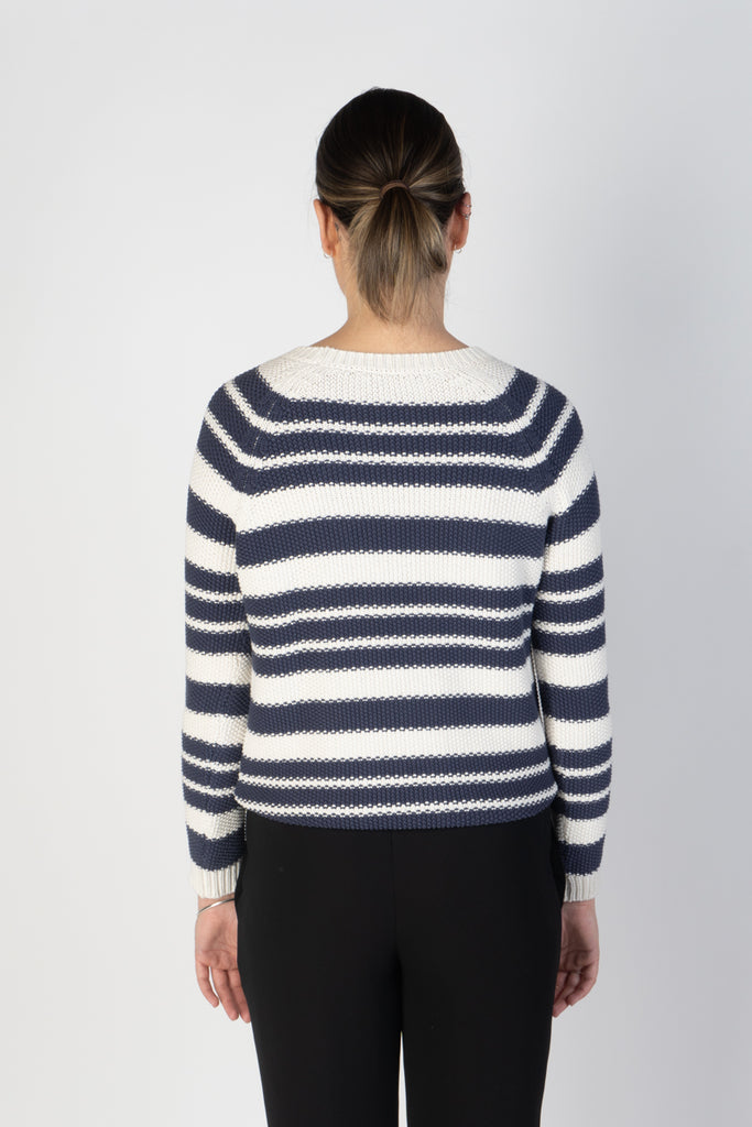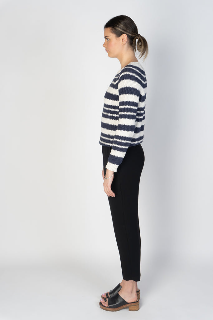 Navy and White striped crew neck Jersey. Such a wardrobe staple to wear with jeans and a white trainer. The striped top will never go out of style