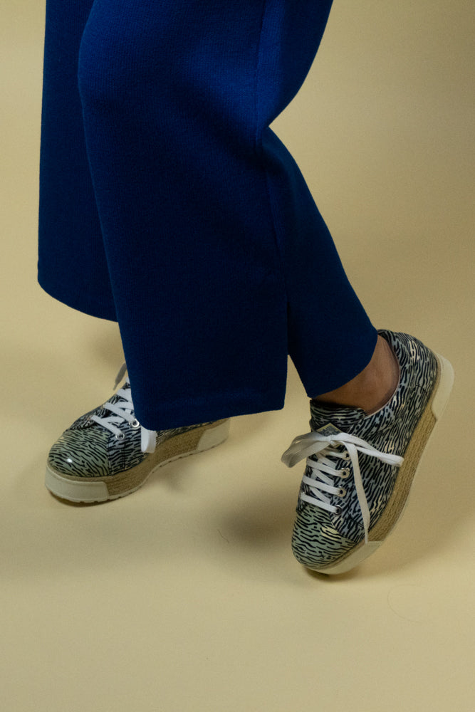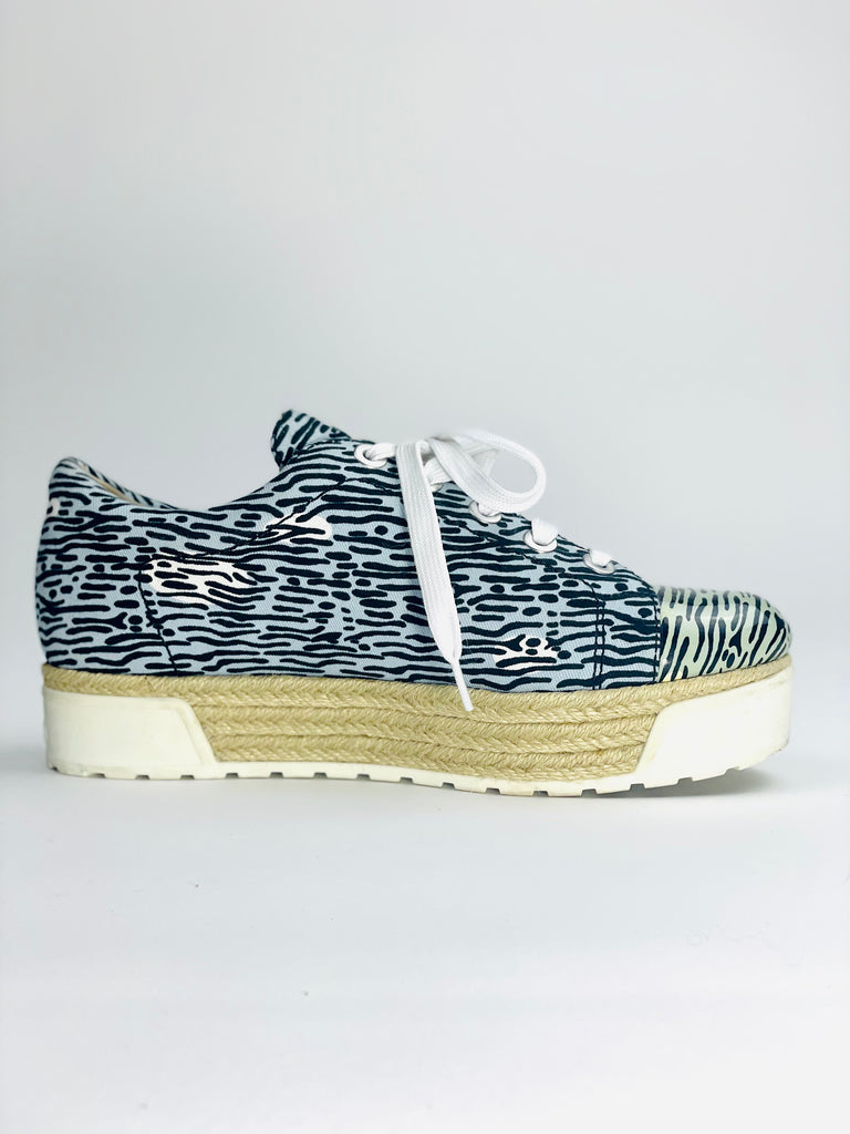 Kenzo low top espadrille sneakers in blue animal print with round, lacquered toes, platform sole and lace-up closure at uppers.