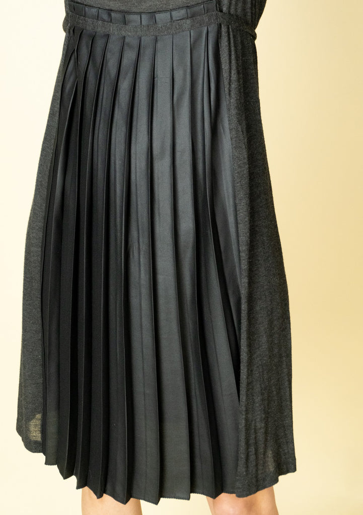 Charcoal grey plunging neckline sleeveless knee-length dress featuring pleated detail at front with attached tie belt at back.