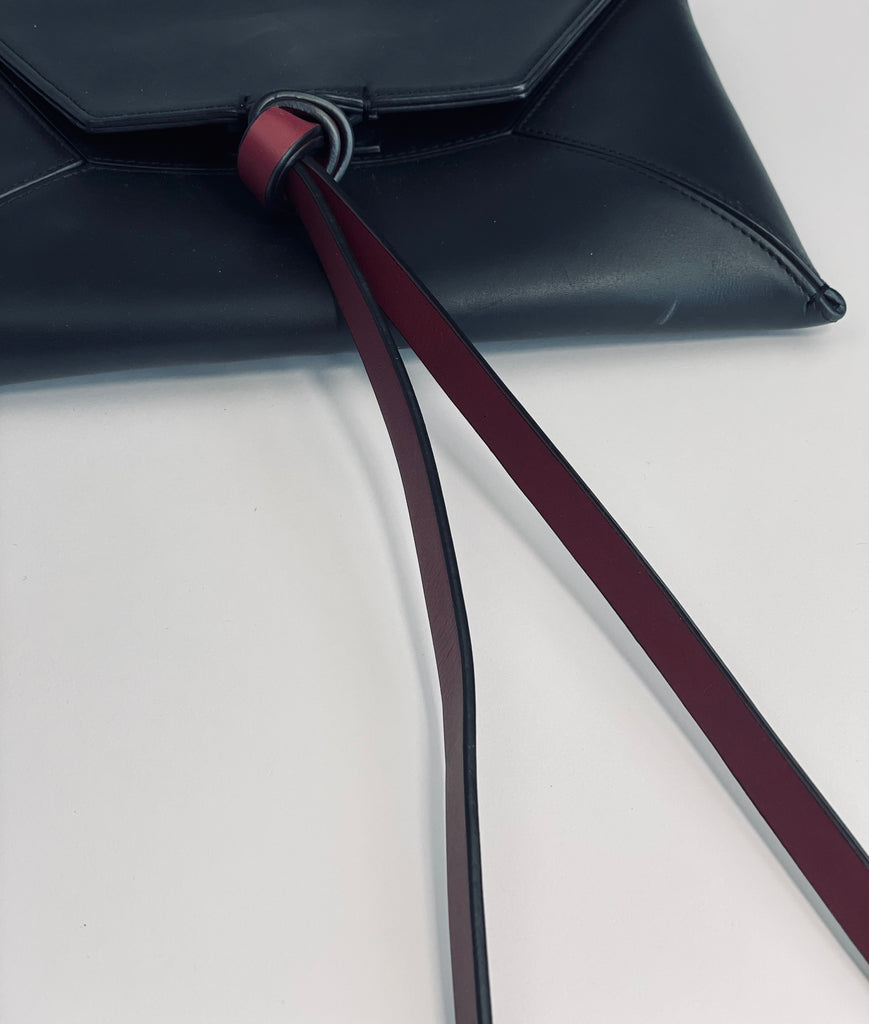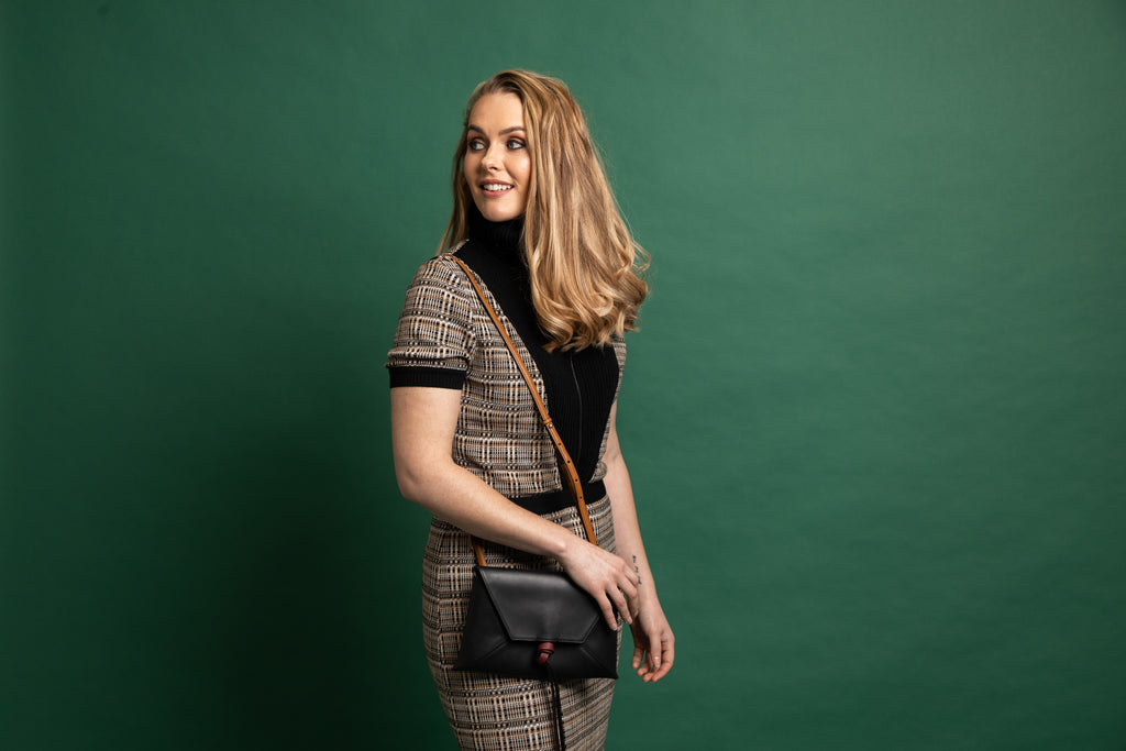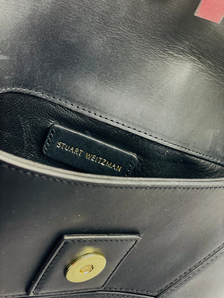 Crossbody bag in black leather with gold-tone hardware. Leather lining & single interior pocket with snap closure at front.